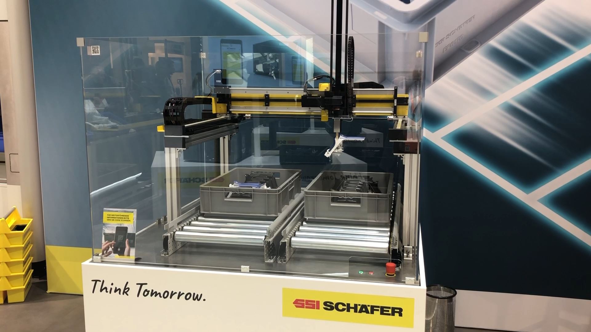 The company SSI Schäfer presented this compact picking cell at Fachpack. In the application, handles for irons are pre-sorted by color into Euro containers so that they can be immediately installed in assembly as required after retrieval.