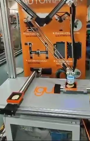 In this application test for a customer, a simple pick and place application from the packaging sector was to be simulated. An igus 2-axis Delta robot was used, which picks up the components and brings them to the desired position with the help of a Cobot pump that generates an electrical vacuum.